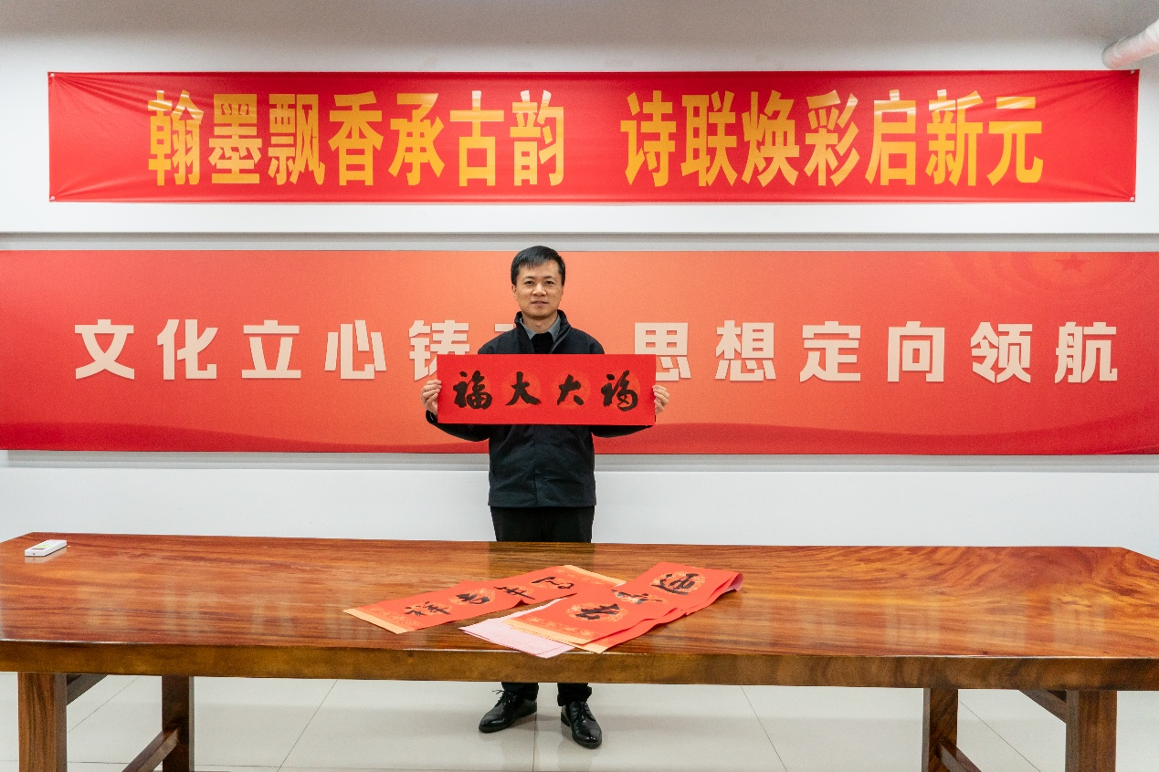 在书写春联环节,老艺术家们手法娴熟,手法炉火纯青,精妙绝伦,撇似游龙,一幅幅栩栩如生的对联出现在艺术家们的手下,一笔一划都寄寓了对来年美好生活的期望和深深祝福。