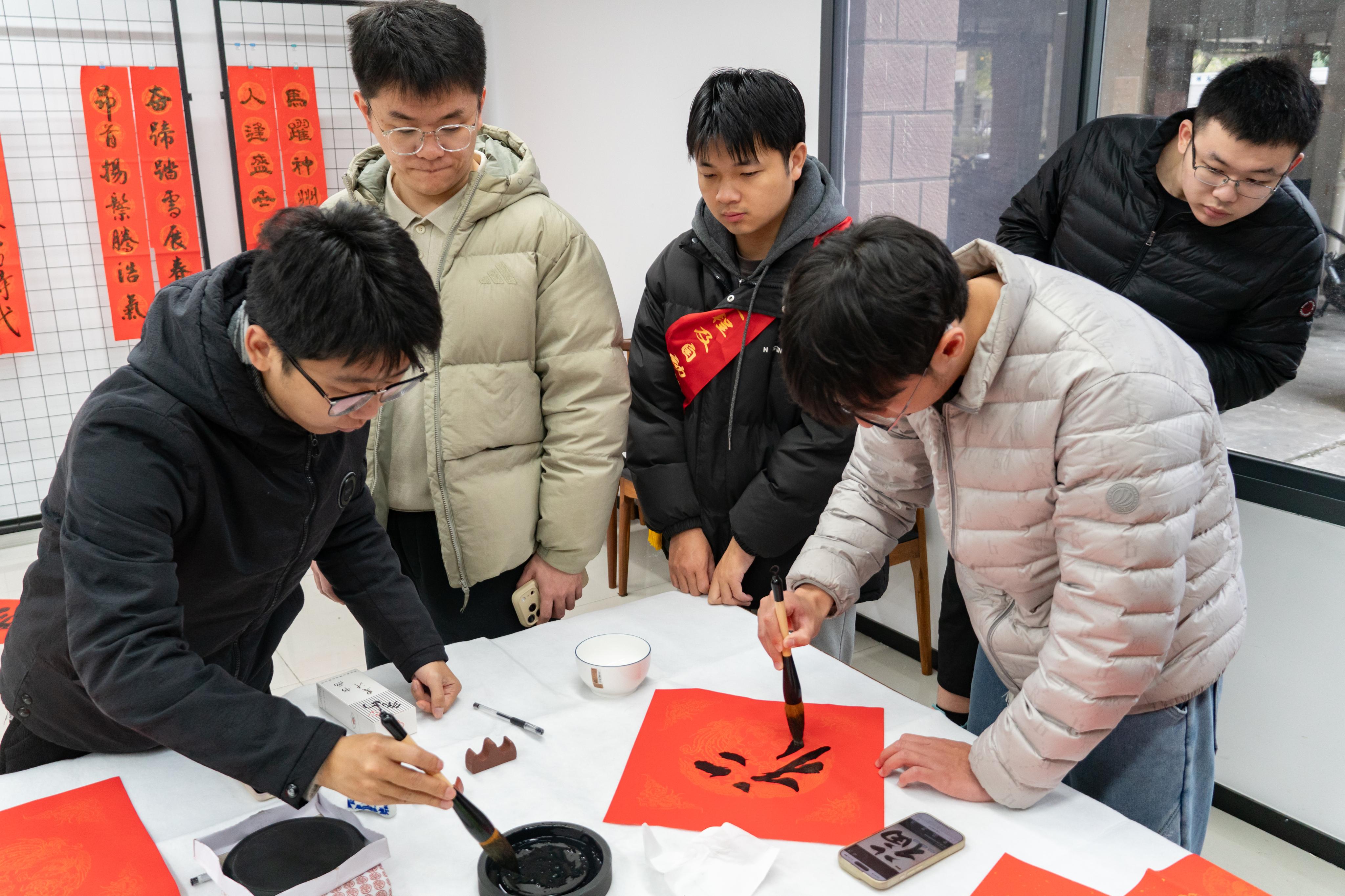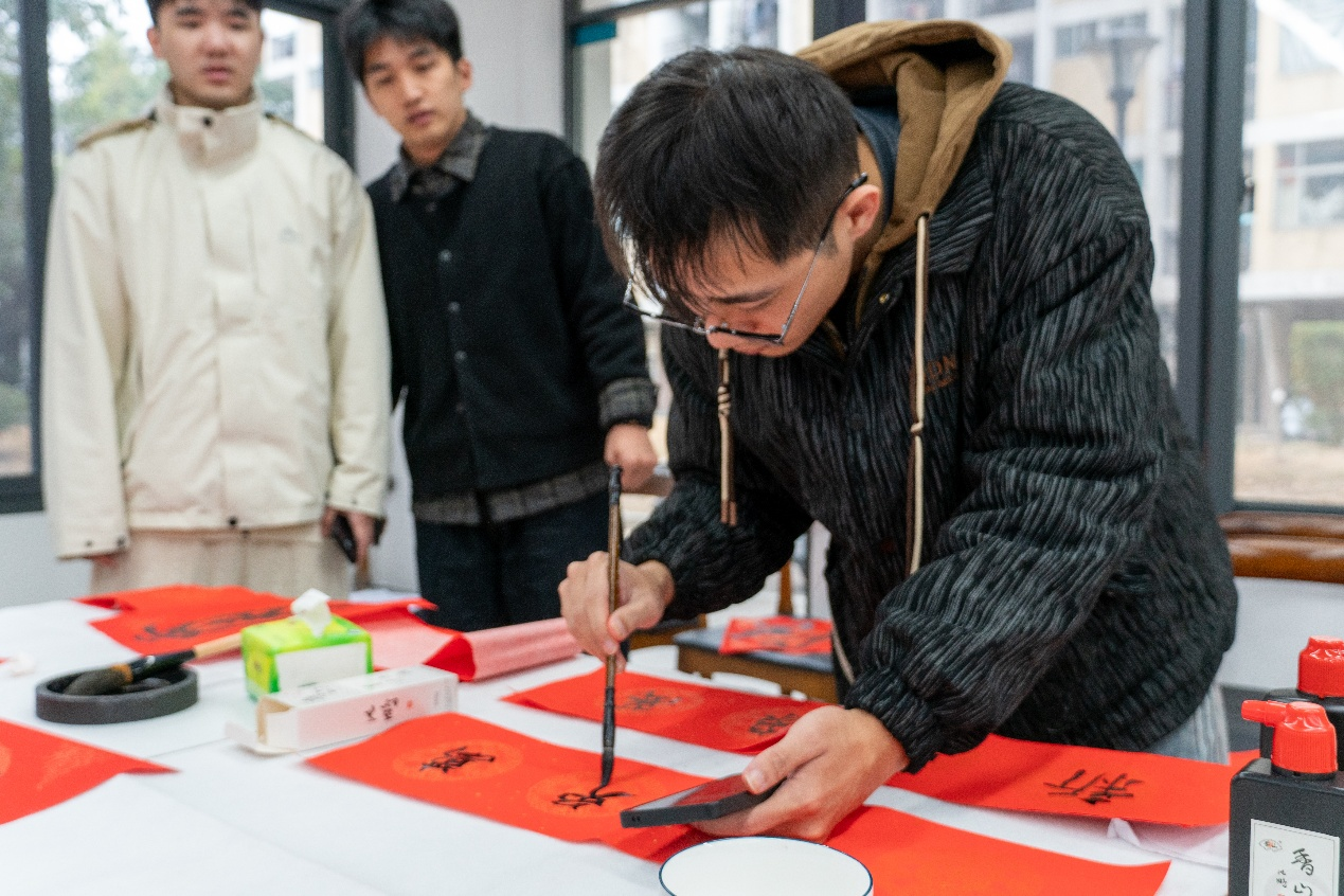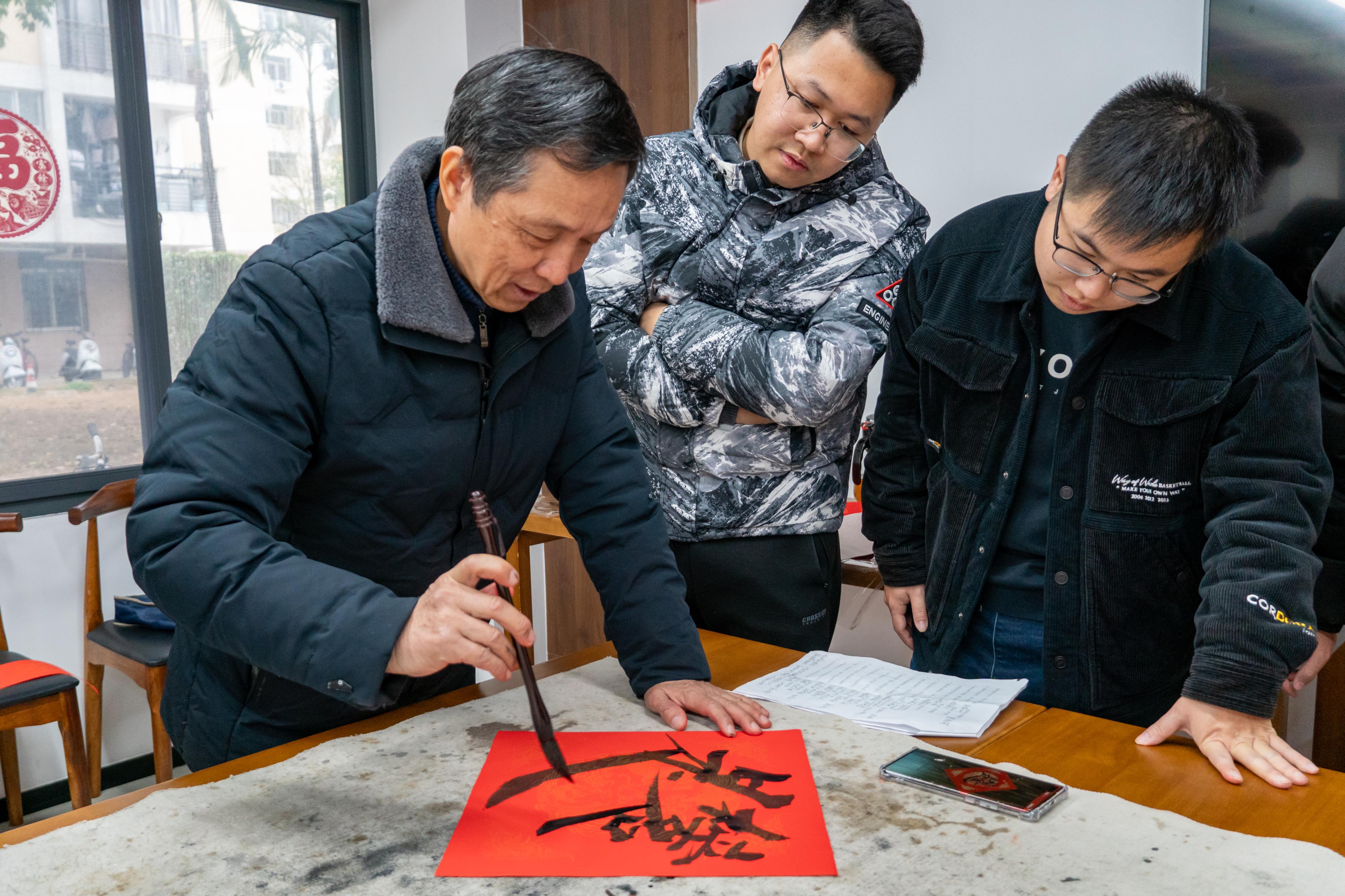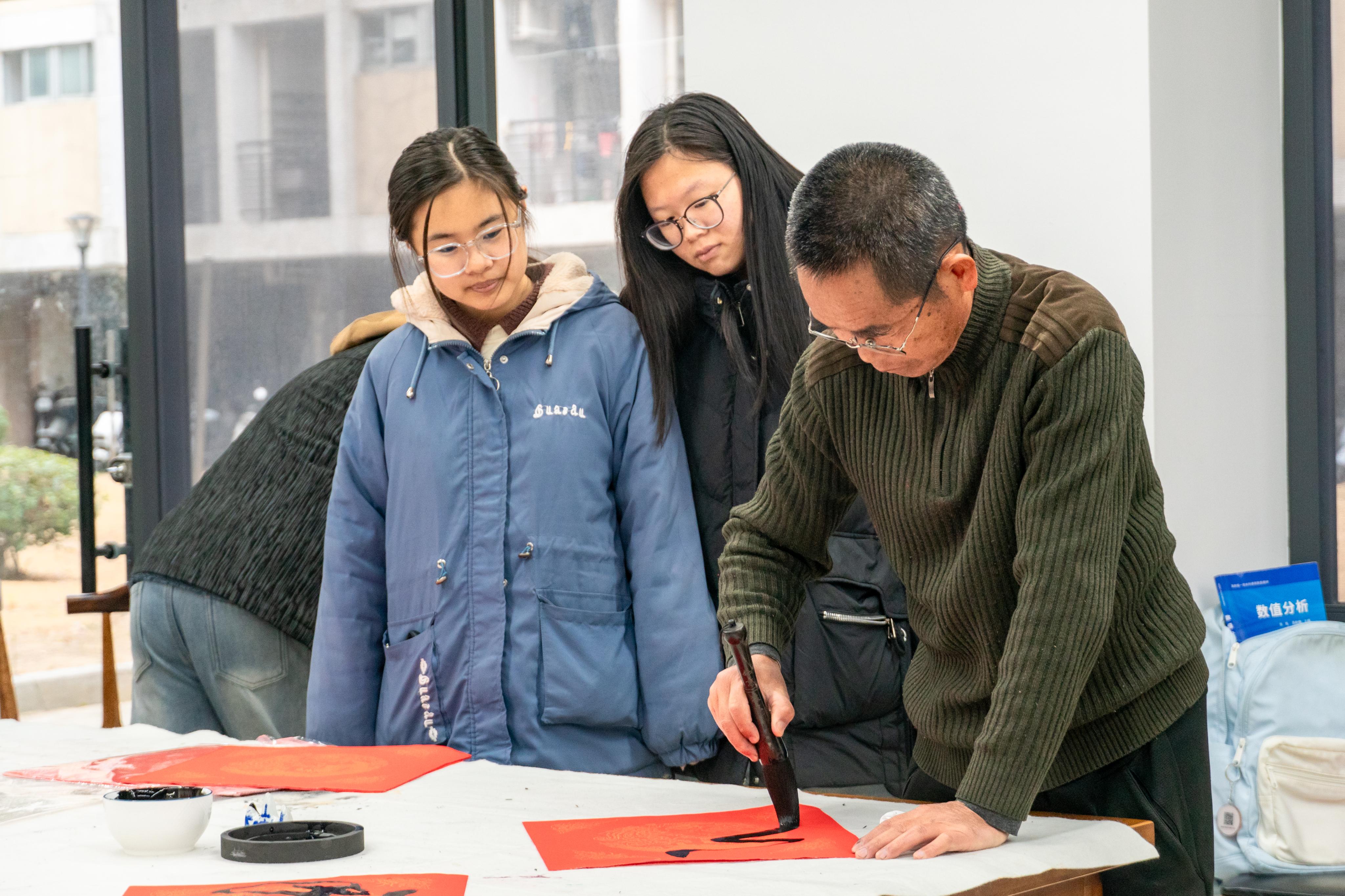 活动中,同学们积极参与其中,他们提杆起笔,书写下飘逸的字迹,在字里寄托自己的美好祈愿和深情祝福。同学们围绕着老艺术家的身旁,领略老艺术家们的笔法之美,倾听在春联背后的传说故事,纷纷动手参与进来亲身体验书法的魅力。